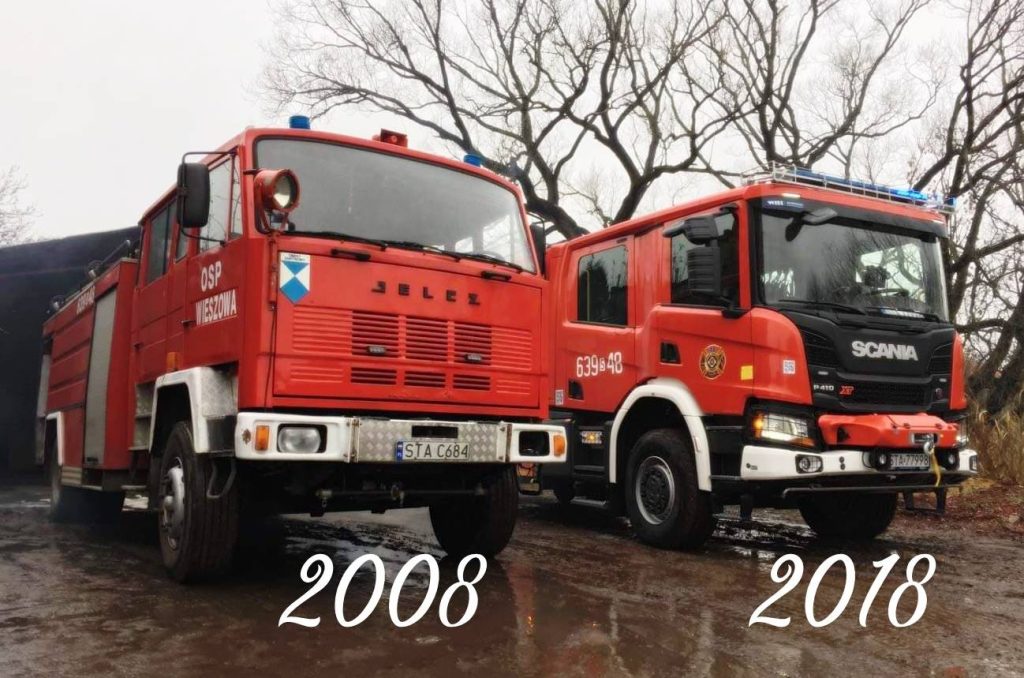 Podsumowując rok 2018 był dla szczególnie historyczny a także mieliśmy dużo pracy, Interwencji mieliśmy blisko 92, w tym roku udało się także dużo pozyskać: Samochód ratowniczo – gaśniczy SCANIA P410XT, buty wodery, defibrylator 2 szt, sprzęt dostarczony z pojazdem tj. m.in zestaw ratownictwa wodnego, pilarka łańcuchowa, kamery termowizyjne 2 szt, opryskiwacz spalinowy, Garmin GPS 2 szt, lokalizator gazu, parawan ochronny, ręczna piła do szyb, chwytak na gady, podnośnik HI-LIFT, rolki transportowe 4 szt.